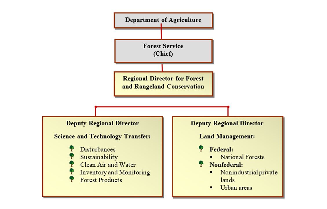 The Regional Director for Forest and Rangeland Conservation is the lead field Senior Executive. In this example, the number of Regions and Regional Offices can and should be reduced. Research Station headquarters can be eliminated. More and more funds are pushed to the lowest level – the Ranger Districts – where on-the-ground projects get done.