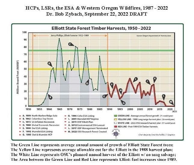 The graph below tells the story of timber growth and how harvest has been impacted through time by wildfires, spotted owl and marbled murrelet listings, recessions, wind storms, management termination in 2017 and the Land Board’s controversial decision to create an Elliott State Research Forest in 2020.